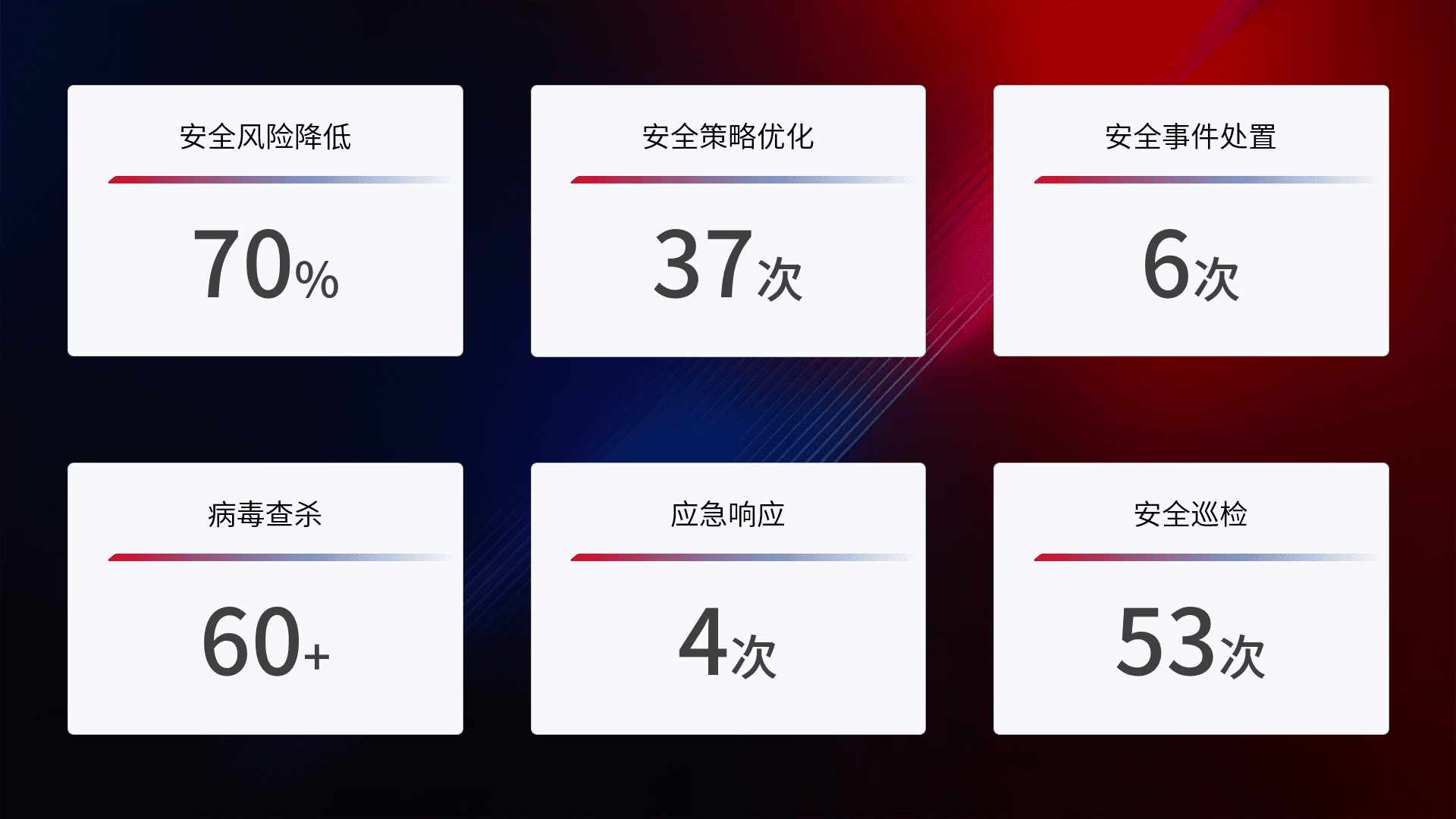 提供全面的安全事件报告体系,,包括处置报告、、周报、、季度和年度总结,,结合持续监控,,,,帮助客户深入了解网络安全状况。。