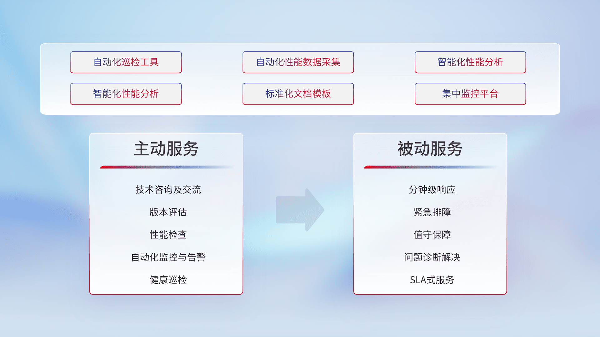 智能化工具和标准化文档,,,,保障服务质量,,,提供主动服务(包含技术咨询、、、、版本评估、、性能检查、、自动化监控与告警、、健康巡检)和被动服务包含(分钟级响应、、、紧急排障、、、、值守保障、、、问题诊断解决、、、SLA服务)。。。